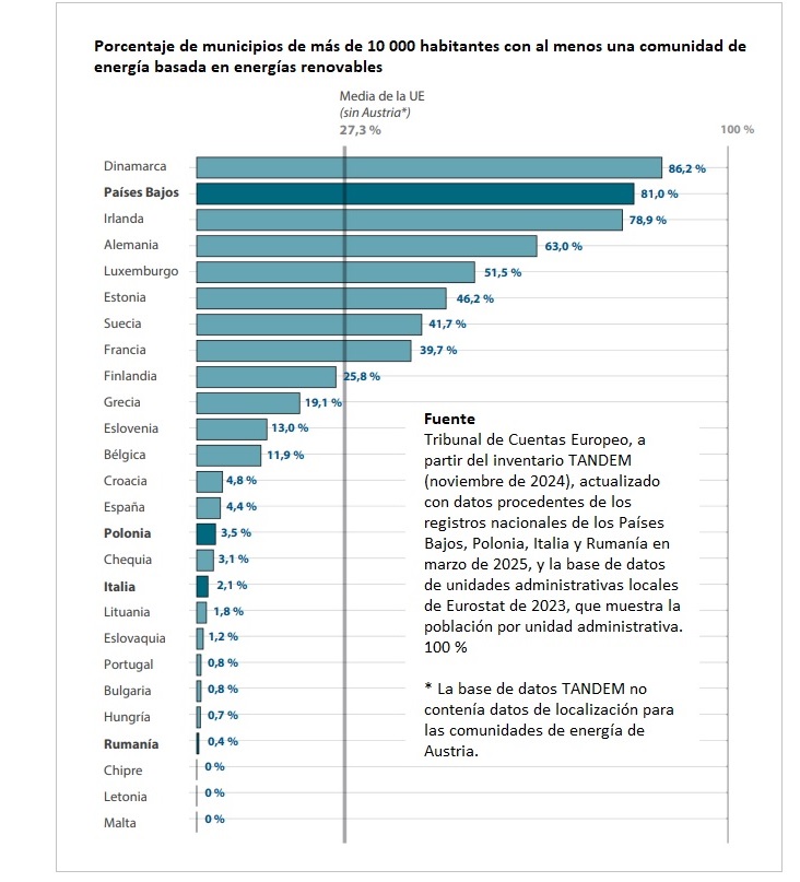 Las diferencias son abismales entre los países que más cerca están del horizonte 2030 que la Unión Europea quiere para las comunidades energéticas y los que están más lejos. Dinamarca (84) o Países Bajos (81,0%) están en un extremo de la tabla, mientras países como España (4,4) o Italia (2,1) se encuentran en las antípodas. ¿Media en la UE? 27,3, es decir, que solo el 27,3% de las ciudades UE de más de 10.000 habitantes tienen una comunidad energética (CE). El porcentaje (27) se encuentra alejadísimo de la ambición expresada por la Comisión, que quería un 100% en 2025, o sea, que todas las ciudades de más de 10.000 habitantes tuviesen, en 2025, "al menos una" comunidad energética. Más aún: los autores del informe estiman que las comunidades de energía "podrían ser propietarias del 4% de la capacidad de generación de energía solar y eólica para 2030", lo que también estaría extraordinariamente por debajo del 21% y el 17% "declarados por la Comisión en la evaluación de impacto de la Directiva sobre fuentes de energía renovables II". ¿Conclusión? Las ambiciones que había colocado en el horizonte la Comisión Europea distan mucho-mucho de su materialización. El Tribunal de Cuentas además tiene claros los motivos de esa lejanía: "los gobiernos no han creado todas las condiciones necesarias para apoyar el desarrollo de las comunidades, en particular al no abordar los aspectos reglamentarios no resueltos y los retrasos en las conexiones a la red".