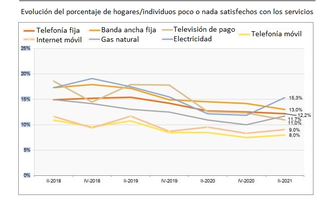 Varios cambios significativos recoge el Panel de Hogares de la CNMC correspondiente al segundo trimestre (abril, mayo, junio) del corriente. Para empezar la electricidad se aúpa an primer cajón del podio en la clasificación de servicios mal valorados por la ciudadanía. Desbanca así a la banda ancha fija. Los servicios de telecomunicaciones continúan siendo no obstante los que han registrado más reclamaciones, según la Comisión Nacional de los Mercados y la Competencia. En cuanto al grado de satisfacción con los precios y con la atención al cliente, el informe de la CNMC asegura que ha mejorado en todos los casos, "menos en los servicios de luz y gas". En concreto -apuntan desde la CNMC-, en el segundo trimestre de 2021, un 15,3% de los hogares manifestaron estar poco o nada satisfechos con el servicio eléctrico, en comparación con el 12,2% en el mismo periodo de 2020. En el caso de la banda ancha y la telefonía fija, la valoración mejoró levemente: los hogares insatisfechos fueron un 13% y un 12,2% respectivamente, mientras que en 2020 representaron un 14,5% y un 12,7%. Los servicios de telecomunicaciones móviles fueron los que ostentaron mejores valoraciones de los usuarios: el porcentaje de consumidores insatisfechos rondó el 9%.